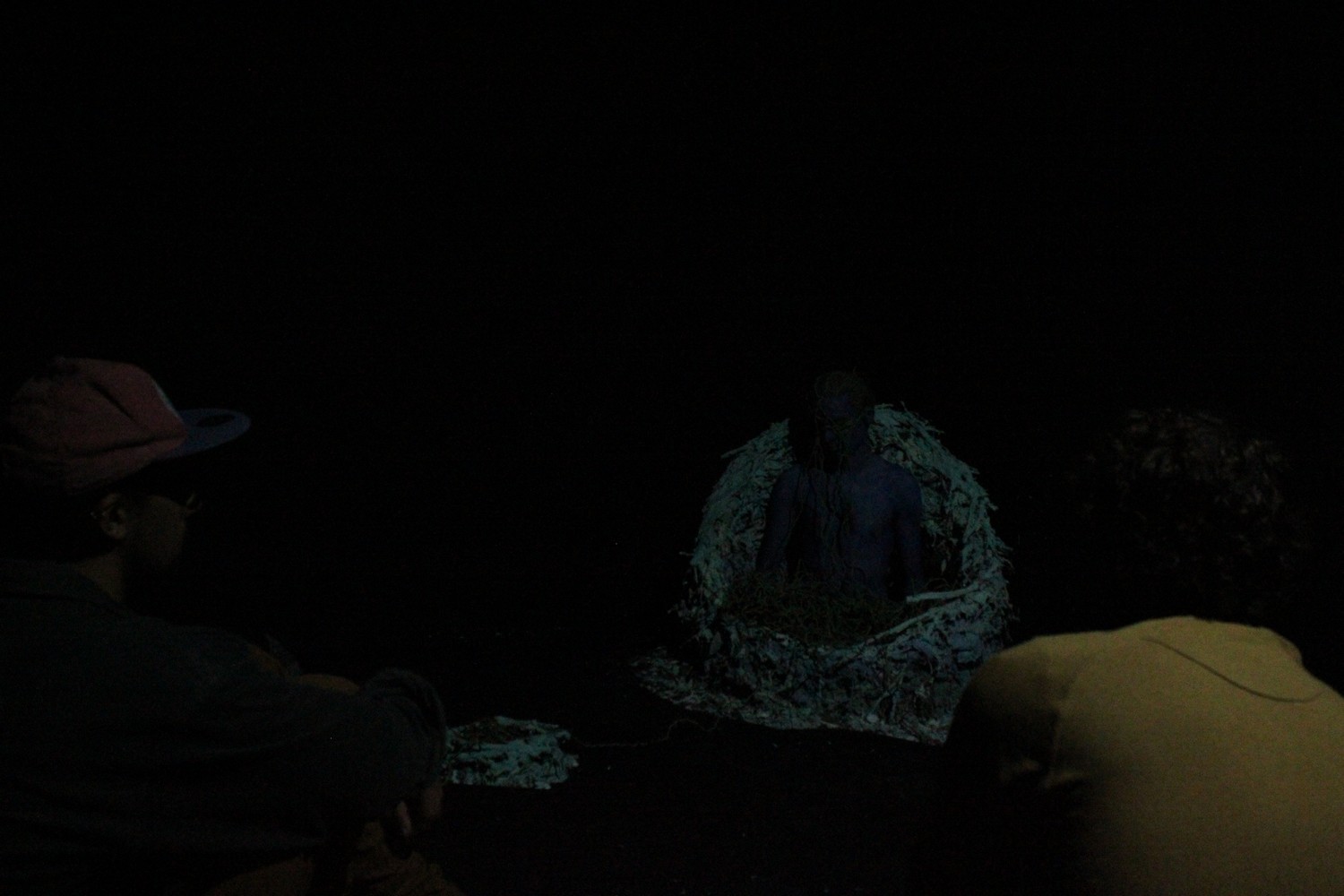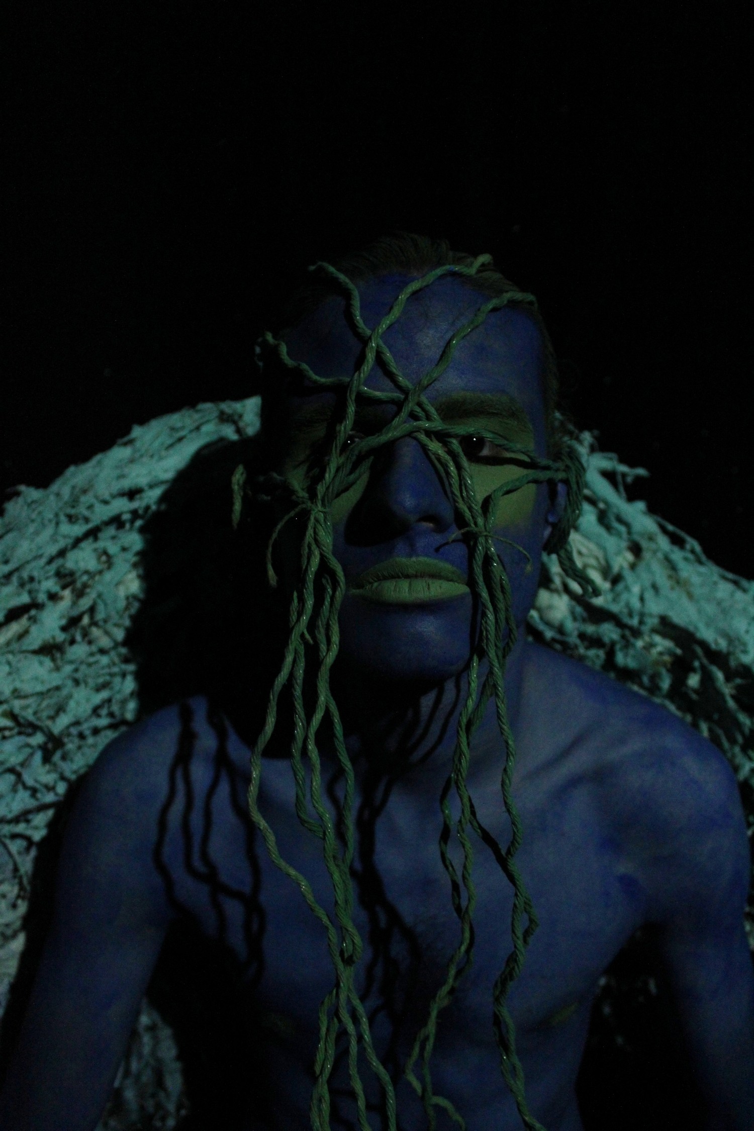 Le Pleureur est une performance dans laquelle j'incarne un personnage maquillé de bleu et de vert, dont la tête est liée à des cordes vertes (ou des lianes) parsemées de petits picots roses, qui s'étendent jusqu'à former un cercle.
